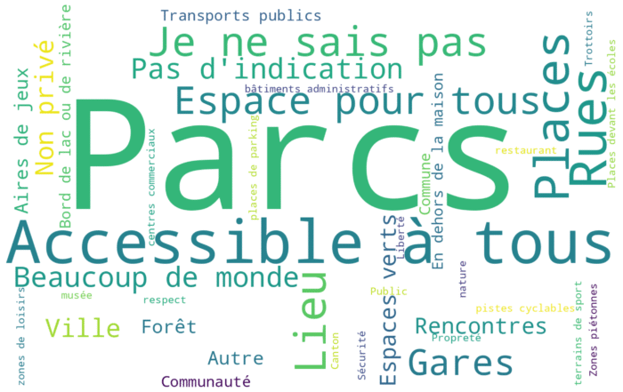 L’enquête montre que de nombreuses personnes sont conscientes de l’espace public. Les parcs, les zones piétonnes, les places et les trottoirs sont particulièrement souvent cités comme en faisant partie. Les bâtiments administratifs ou les bibliothèques sont en revanche moins souvent cités. Il existe des différences notables selon le lieu de résidence : les personnes vivant à la campagne considèrent plus souvent les parkings comme des espaces publics que les citadins. Il existe également des différences entre les régions linguistiques – par exemple, les places d’école, les gares et les routes sont moins souvent considérées comme publiques en Suisse romande et au Tessin, alors que les aires de jeux le sont plus souvent qu’en Suisse alémanique.